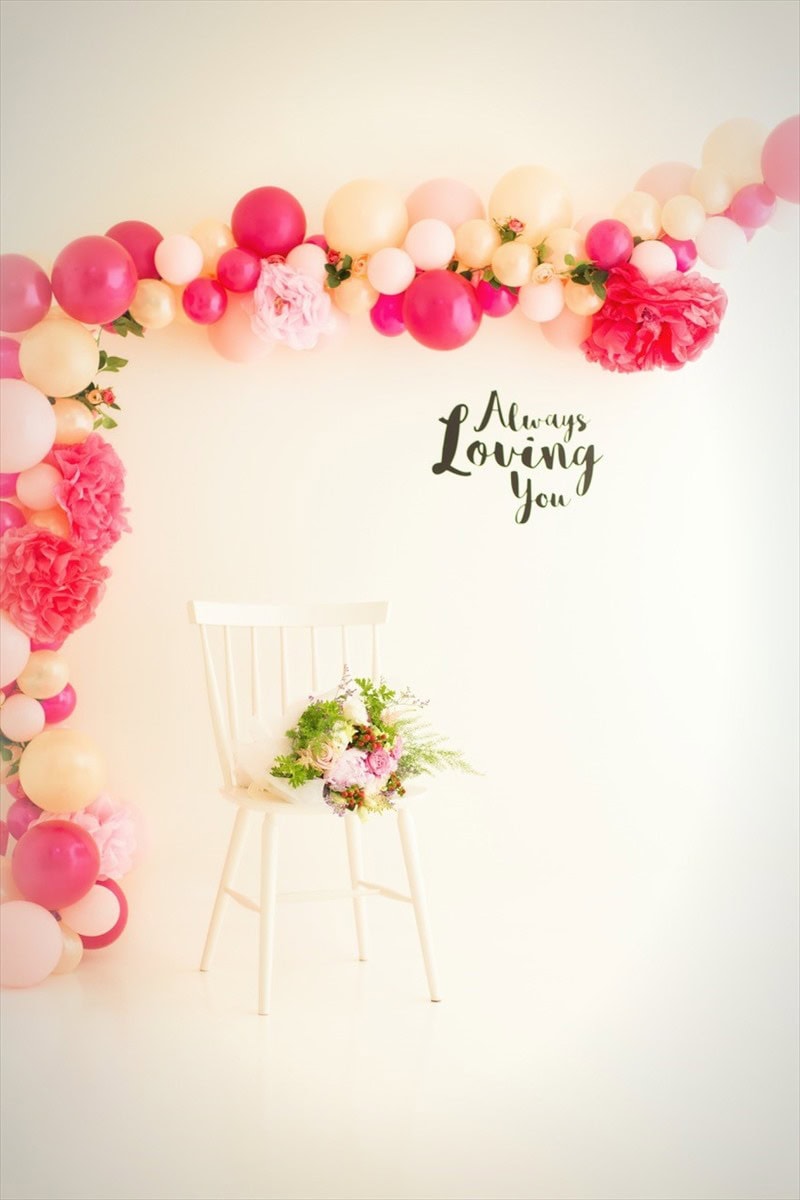 バルーンガーランドには、薄紙でできたフラワーポムとフェイクグリーン・フェイクフラワーを絡めて、お写真と一緒に写るように『Always Loving You』のウォールステッカーを貼り、おとなっぽい雰囲気に仕上げました。