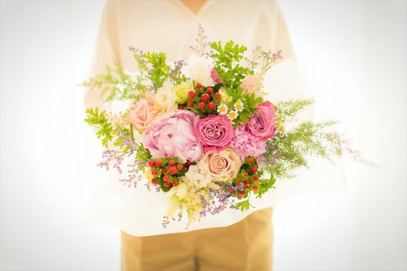 2階は淡いカラーの生花がふんだんに用意され、明るく華やか空間。