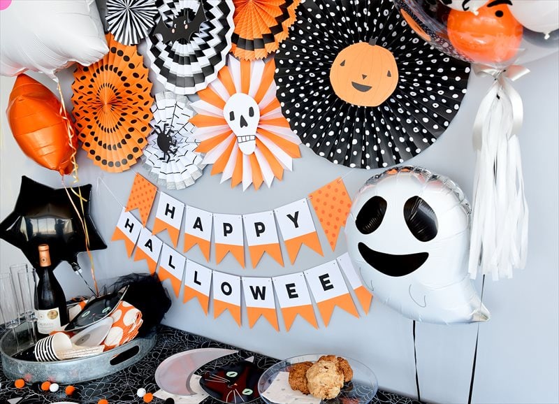 あざやかなオレンジとホワイトのバイカラーがキュートなHAPPY HALLOWEENのレターバナーを中心に、ハロウィンカラーのペーパーファンを。