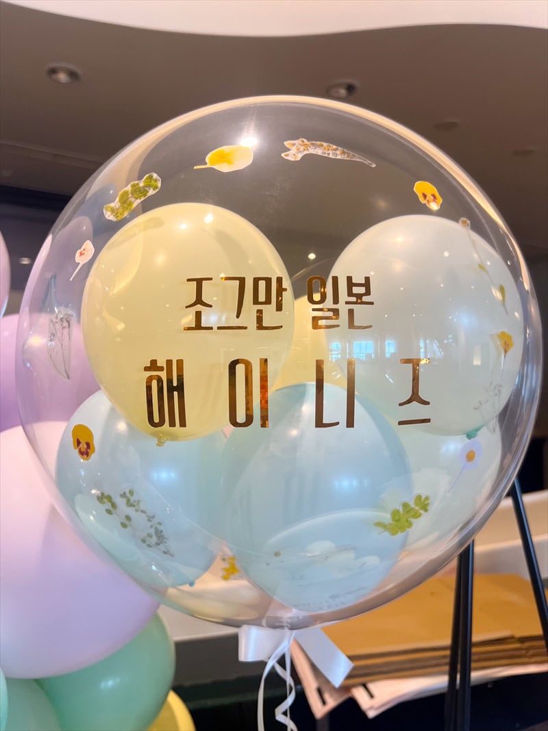 また、今回のご依頼者 小さなヘイニズ(@sjhaeiness) 様のロゴを入れた特製バブルバルーンや、メッセージボードも一緒に飾り付け。さらに等身大パネルも設置し、訪れたファンの皆様が自然と笑顔になる空間が完成しました。