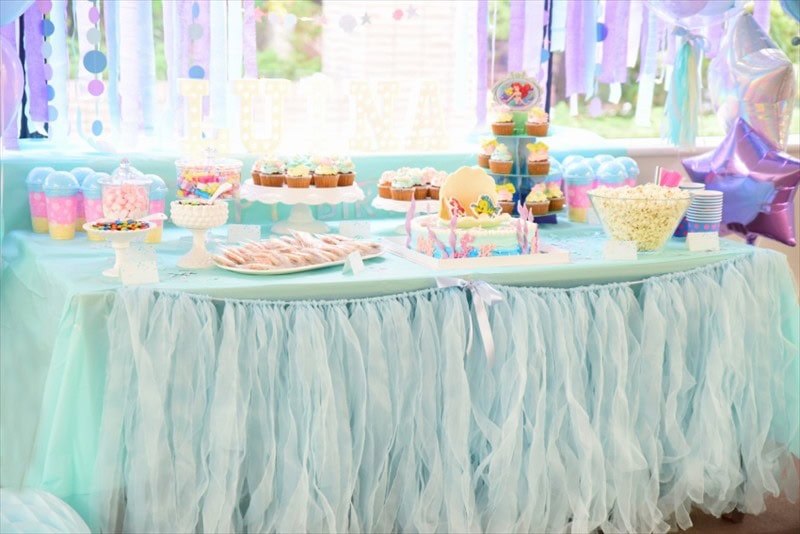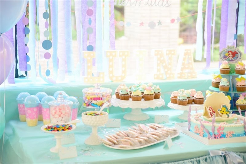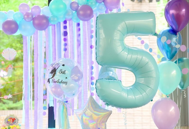お誕生日パーティーの定番であるビッグナンバーバルーンは、マーメイドテーマに合わせてライトブルーをチョイスしました。![]()