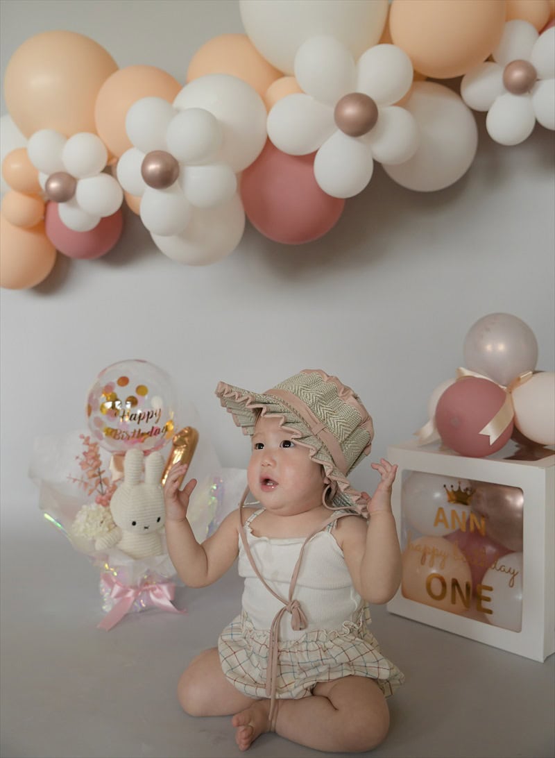 今回はバースデーガールの好きなミッフィーちゃんと、お花のバルーンを使ってかわいらしいイメージでおうちスタジオを作り記念日写真を撮らせていただきました。