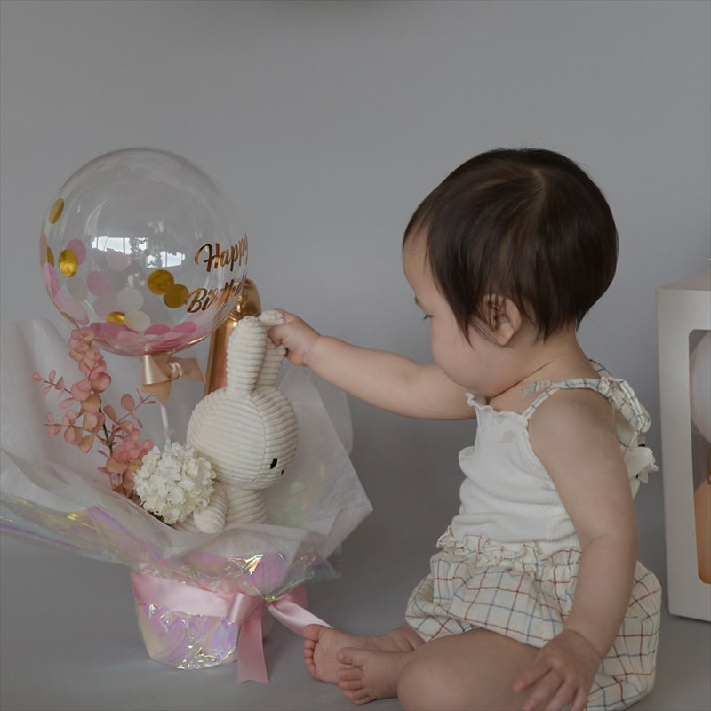 1歳のお祝いにちょうど良いサイズ感で、テーマカラーに合わせて中身のバルーンの色を選べたり、お名前や年齢をオーダーメードで入れられるので、特別感のあるデコレーションになります。