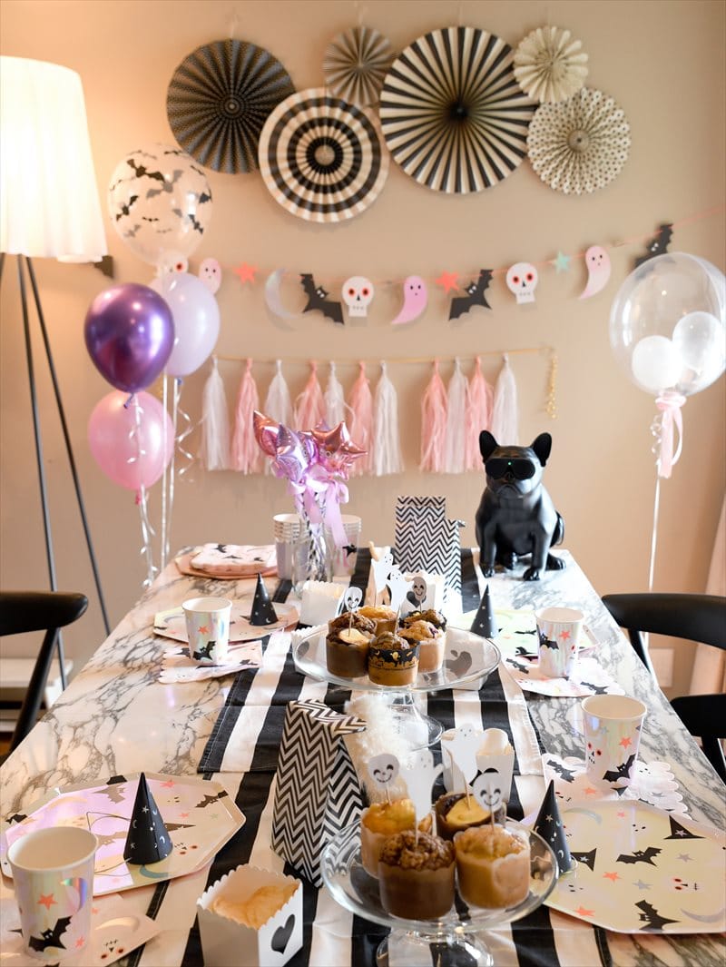 meri meri のハロウィンアイコンシリーズに使われているイリディセントカラーに合う、ピンクやパープルを中心に、ハロウィンらしいモチーフを使ったブラック系のアイテムを使ってデコレーション。