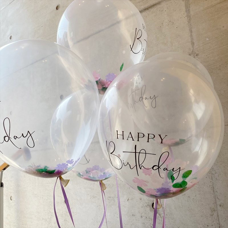 デコレーション&ゲストのお土産用のバルーンは、ラプンツェルテーマにぴったりなお花のコンフェッティ入りのクリアバルーン。ヘリウムガスを入れて浮かぶバルーンはどのパーティーでも子供の人気ナンバーワン。