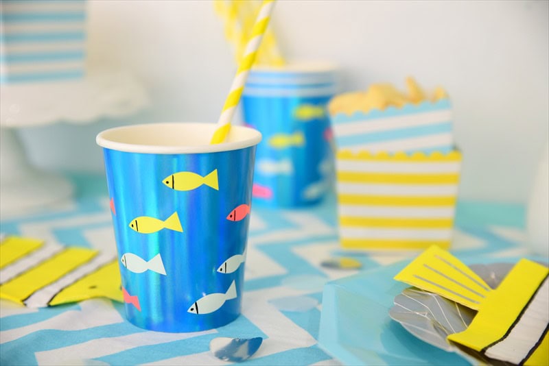 そんな海テーマにぴったりのアイテムは、先日アメリカから届いたばかりのMeri Meri メリメリの新作「アンダーザシーシリーズ」。カラーテーマは海のブルーと、お魚のイエローをベースに、夏の海の爽やかなイメージでプランニングしました。