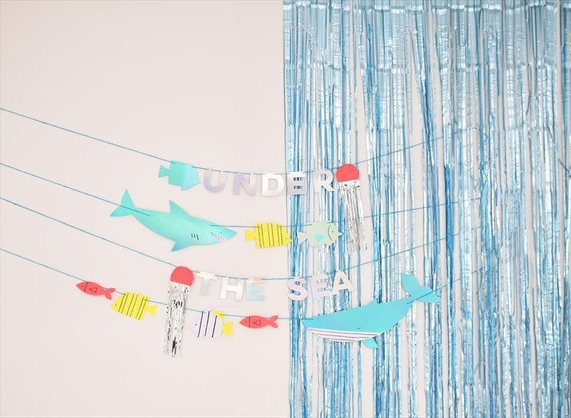 デコレーションアイテムとしてまず初めに決めたのは、海をイメージさせてくれるブルーのホイルカーテンと、meri meri の UNDER THE SEA ガーランド。この2点を壁に貼るだけでもうすでに海の底にいるような気分になります。