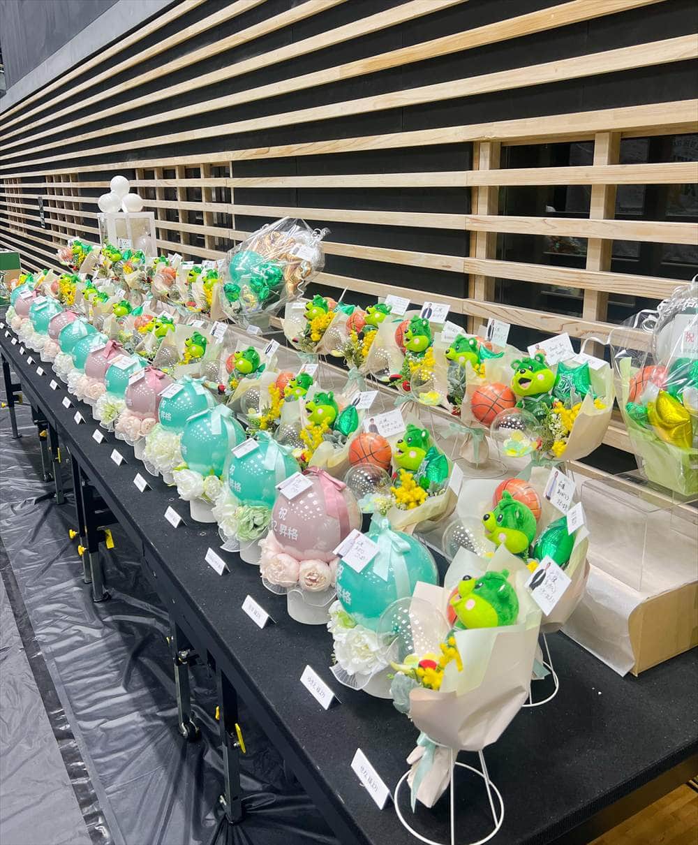 ご注文いただいたバルーンは、お客様が指定した選手宛のメッセージカードを付けて会場に飾り、試合後に選手へプレゼント。